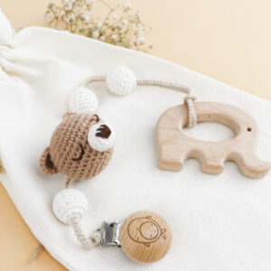 Schnullerclip aus hochwertigen Materialien, erhältlich in zwei liebevollen Designs: Osito und Zorrito. Handgefertigt aus 100 % Baumwollgarn, extra weich und angenehm, ideal für den täglichen Gebrauch.